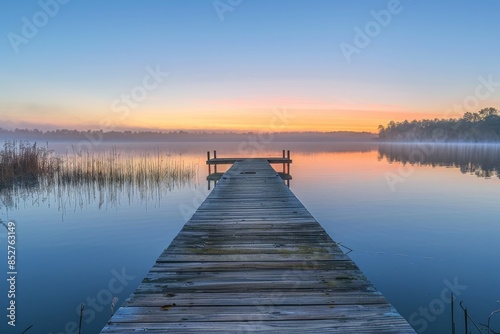 © Raysalova, Fototapeta premium A serene lake with mist rising at dawn, wooden dock extending into water, calm blue sky overhead
