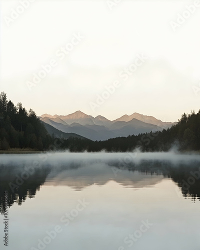 © LAILY, Fototapeta premium A serene lake with mountains in the background, shrouded in fog.