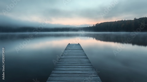 © Mufida's Gallery, Naklejka premium A serene lake with sunrise view. lake and a wooden dock