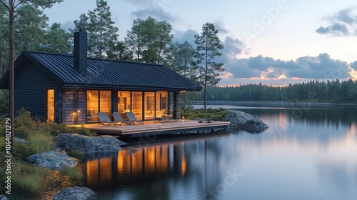 Fototapeta premium A serene lakeside cabin at dusk, reflecting warm lights and surrounded by...