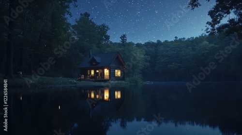 Fototapeta premium a serene lakeside cabin reflecting on still waters under a starry...
