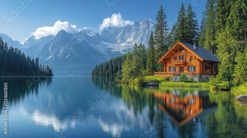 Fototapeta premium A serene lakeside cabin surrounded by mountains and trees, reflecting on calm waters.