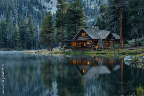 © KP, Obraz premium A serene lakeside cabin surrounded by pine trees.