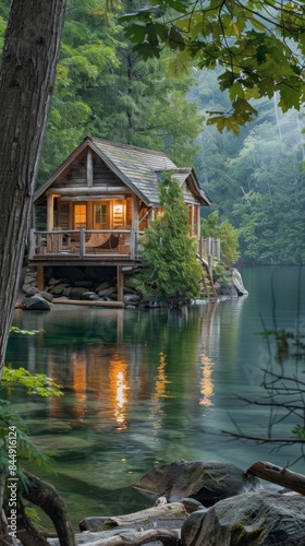 Fototapeta premium A serene lakeside cabin with a view of the water