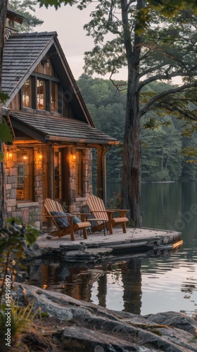© peppastocker, Obraz premium A serene lakeside cabin with a view of the water