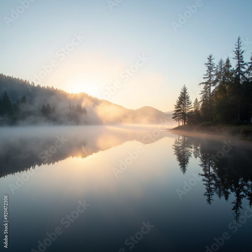 © Mr.Pancho Store, Fototapeta premium A serene lakeside scene at dawn, with soft mist rising from the water and a tranquil atmosphere that captures the peaceful, early morning ambiance of the natural landscape.