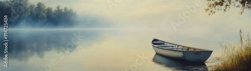© kitidach, Obraz premium A serene lakeside scene with a rowboat and a misty morning