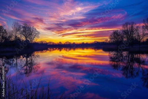 Fototapeta premium A serene lakeside scene with a vibrant sunset reflecting off the water