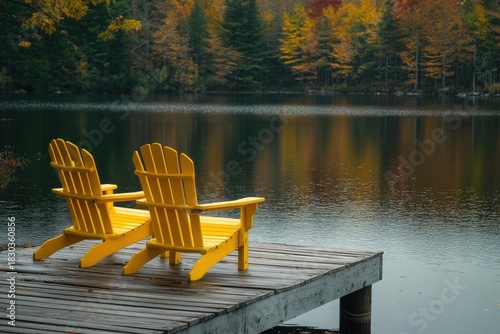 © Sean Hoong, Fototapeta premium A serene lakeside scene with two yellow Adirondack chairs on a wooden dock overlooking a calm lake surrounded by a forest of trees with autumn foliage.