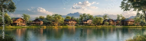 Fototapeta premium A serene lakeside view showcasing tranquil homes surrounded by lush greenery...