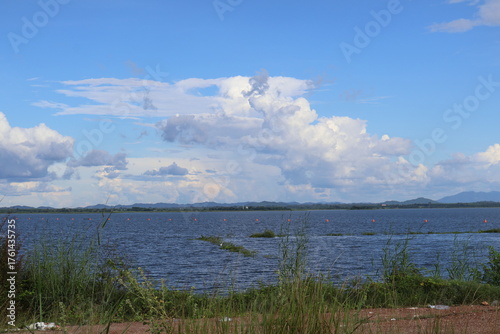 © MakeitEZ-Img&VID, Fototapeta premium A serene lakeside view under a partly cloudy sky. In the foreground, there's an expanse of calm water reflecting the clouds above