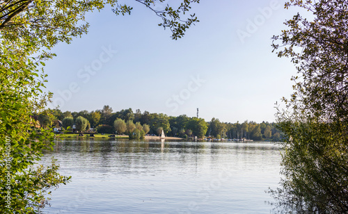 © M.Nergiz, Obraz premium A serene lakeside view with a sandy beach, sailboats, and lush green trees under a clear sky, showcasing a peaceful outdoor recreation scene.