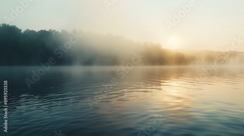 © Chandara, Fototapeta premium A serene lakeside view with mist rising from the water at sunrise.