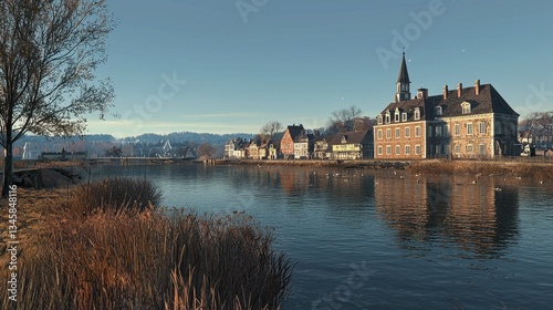 Obraz premium A serene lakeside village scene reflecting in tranquil waters