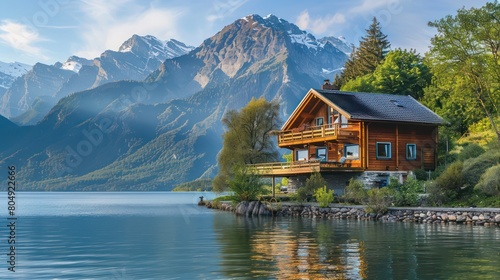 Naklejka premium A serene lakeside wooden cabin, set against a magnificent mountain range and...