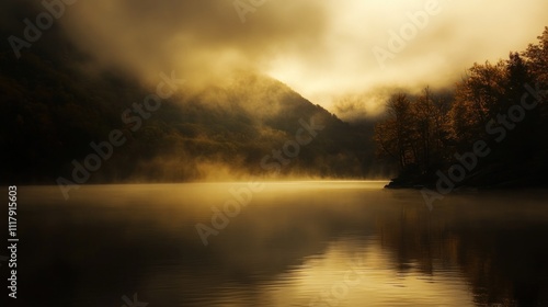 Fototapeta premium A serene landscape at dawn with mist hovering over a calm lake and distant...