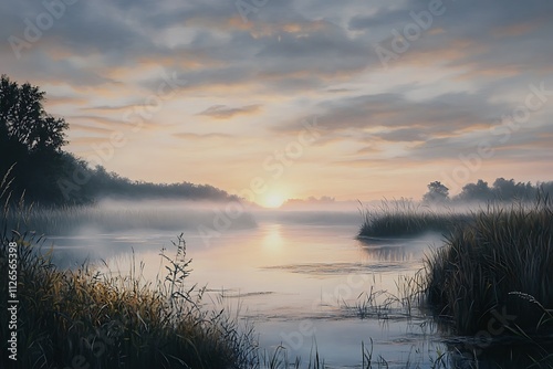 Fototapeta premium A serene landscape at sunrise over a misty river, surrounded by lush vegetation.