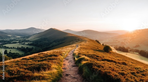 Fototapeta premium A serene landscape at sunrise, revealing rolling hills, a winding path, and...