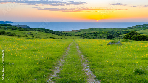Obraz premium A serene landscape at sunset, featuring a dirt path leading through lush greenery towards the ocean