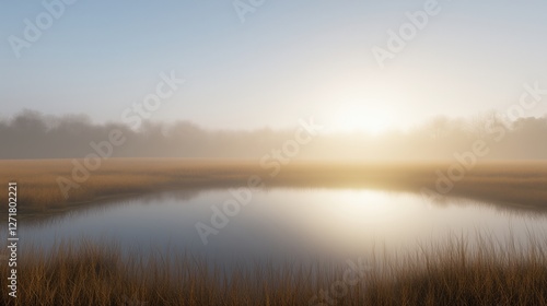 © kept, Obraz premium A serene landscape featuring a calm pond surrounded by tall grass at sunrise.