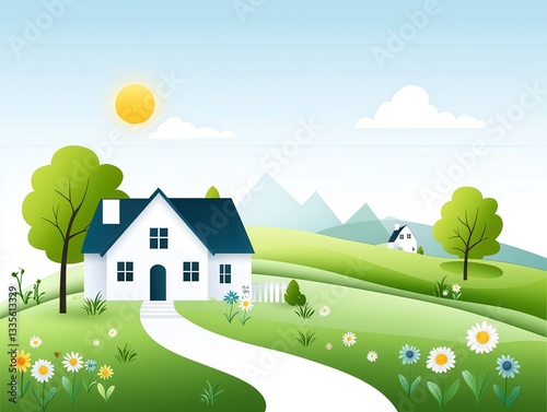 Fototapeta premium A serene landscape featuring a charming house on a winding path surrounded by flowers