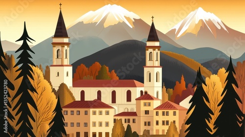 Naklejka premium A serene landscape featuring a church in a mountain town