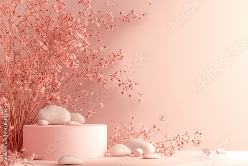 Fototapeta premium A serene landscape featuring a circular pedestal surrounded by delicate pink...