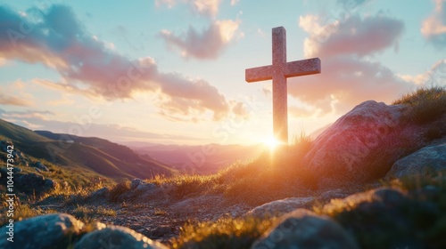 Obraz premium A serene landscape featuring a cross at sunset, symbolizing faith and...