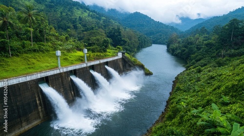 © Sumet, Fototapeta premium A serene landscape featuring a dam, flowing water, and lush greenery surrounded by majestic mountains and a tranquil river.