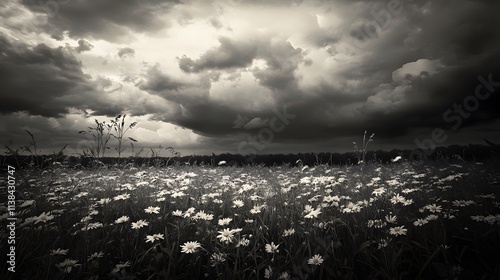 Fototapeta premium 99. A serene landscape featuring a field of wildflowers under a moody sky in monochrome