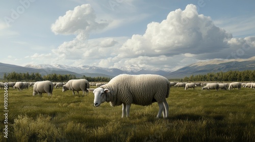 Fototapeta premium A serene landscape featuring a flock of sheep grazing in a lush green field...