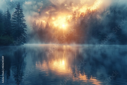 Obraz premium A serene landscape featuring a forest under a misty sunrise with reflections...