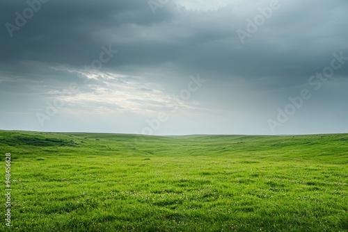 Obraz premium A serene landscape featuring a lush green field under a dramatic sky, evoking...