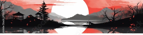 Fototapeta premium A serene landscape featuring a silhouetted fisherman by a tranquil lake at...