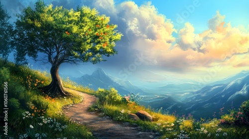 Obraz premium A serene landscape featuring a tree beside a winding path, with mountains and...