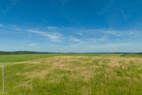 © daily_creativity, Obraz premium A serene landscape featuring a vast green field under a clear blue sky with wispy clouds. This tranquil scenery is perfect for nature lovers and outdoor enthusiasts.