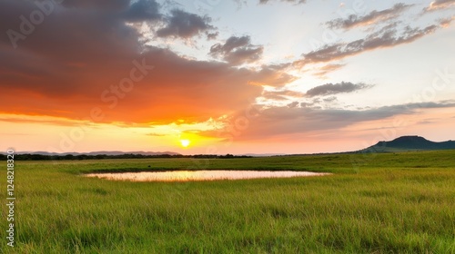 © Po, Obraz premium A serene landscape featuring a vibrant sunset over a grassy field with a small pond, surrounded by gentle hills and a colorful sky.