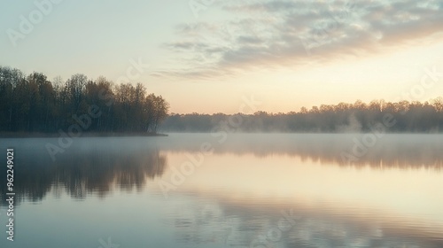 Fototapeta premium A serene landscape featuring a water body surrounded by lush foliage and...
