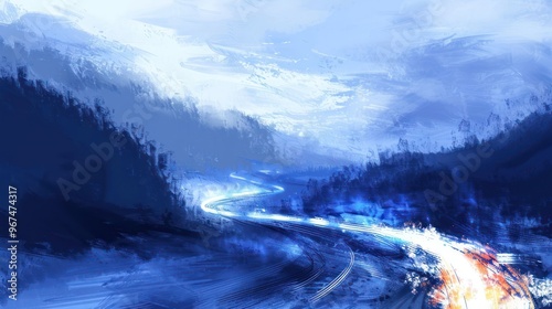 Naklejka premium A serene landscape featuring a winding road through misty mountains and a...