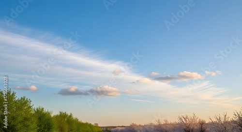Fototapeta premium A serene landscape featuring blooming cherry trees under a vast blue sky with scattered wispy clouds