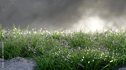 Fototapeta premium A serene landscape featuring dew-covered grass beside a flowing stream.