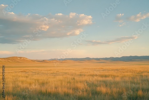 Obraz premium A serene landscape featuring golden grasslands under a blue sky with soft...