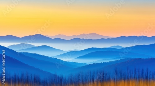 Fototapeta premium A serene landscape featuring layered blue mountains fading into the horizon under a gradient sky, Ideal for nature or travel themes in publications, websites, or decor projects,