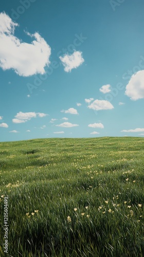 © kitidach, Fototapeta premium A serene landscape featuring lush green fields under a bright blue sky.