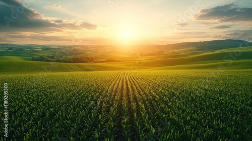 © Matteo_std, Naklejka premium A serene landscape featuring lush green fields under a sunset sky.