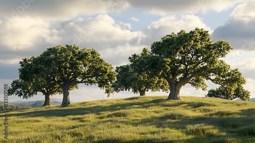© Salman, Obraz premium A serene landscape featuring lush green trees on a gentle hill under a cloudy sky.