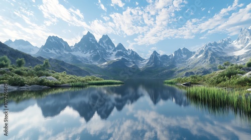Fototapeta premium A serene landscape featuring majestic mountains reflected in a tranquil lake,...