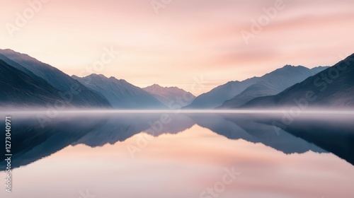 © MINMIN, Obraz premium A serene landscape featuring misty mountains reflected in calm water during a pastel-colored sunrise.