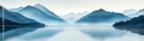 Fototapeta premium A serene landscape featuring misty mountains reflecting on a calm lake,...
