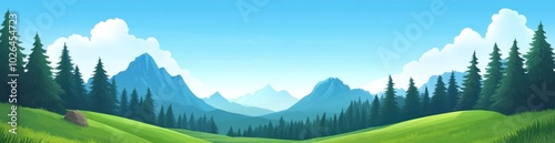 © BerkahStock, Fototapeta premium A serene landscape featuring mountains, forests, and a clear blue sky.